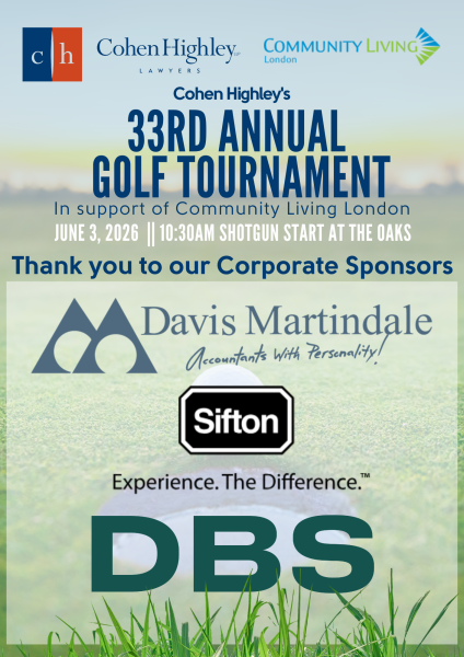 Please join us June 3rd 2026 for Cohen Highley’s 33rd Annual Charity Golf Tournament in support of Community Living London at The Oaks Golf Club.